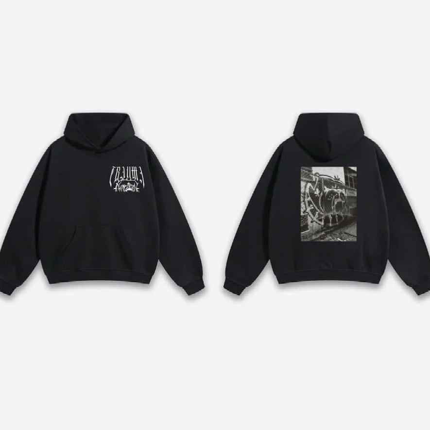 12 oz Heavyweight Hoodie with no draw strings and a loose boxy